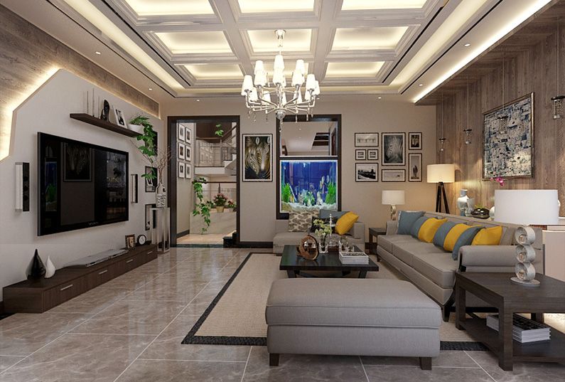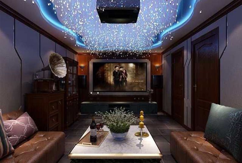 1、視聽間:采用稍冷點的藍色燈帶,木色皮具家具再搭配地面不規(guī) 則灰色地磚,使之與整個空間相得益彰,不失華貴。