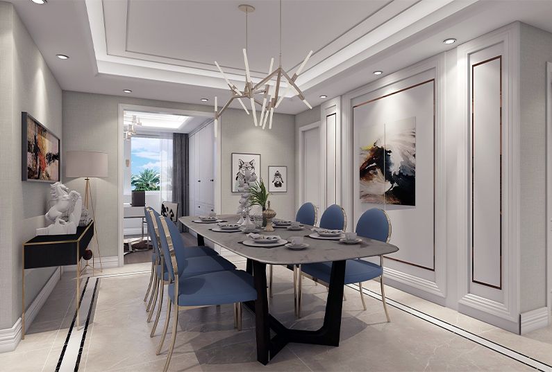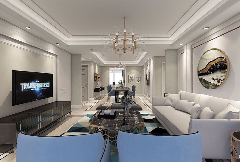 這套案例是一套法式雅致輕奢的設(shè)計(jì),保持了法式風(fēng)格中的固有風(fēng)格和理念,摒棄傳統(tǒng)法式的繁復(fù)、冗雜的裝飾造型與甜膩的色澤,轉(zhuǎn)而用經(jīng)典軸線、對稱布局的方式,嬰兒藍(lán)結(jié)合淺色淡雅的空間色調(diào)或幾何線條與典雅時(shí)尚的陳設(shè)軟裝,打造出一個(gè)法式輕奢主義的空間格調(diào)。