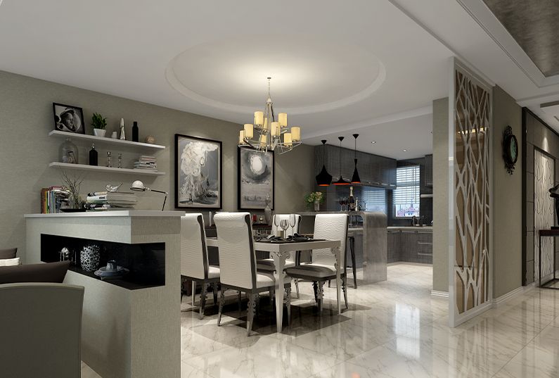 整體墻面顏色采用默綠色的墻面壁紙裝點(diǎn)空間色彩,餐邊柜的設(shè)計(jì)提高了空間利用率。富有設(shè)計(jì)的餐廳吊燈,廚房格局改造開放式
