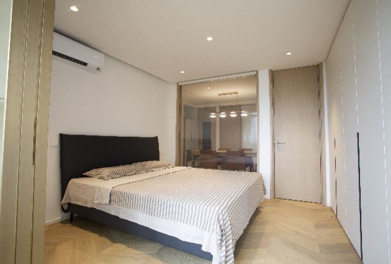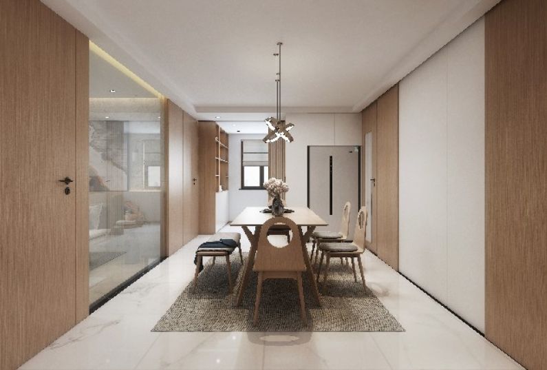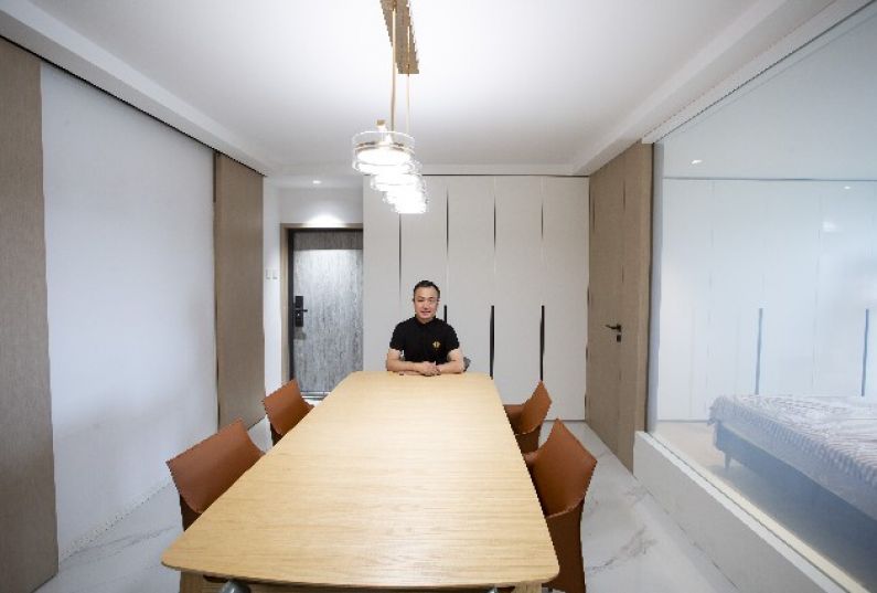 原結(jié)構(gòu)輕體墻拆除,原客廳位置增加臥室空間,隱藏門到頂,霧化玻璃分割活動區(qū)與臥室之間的私密性,原主臥室為孩子兩個孩子的休息學習娛樂的互動空間。原次臥室為老人居室和公共閱讀娛樂區(qū)。衛(wèi)生間改為兩個衛(wèi)生間??蛷d區(qū)用長桌代替?zhèn)鹘y(tǒng)沙發(fā)電視的功能。