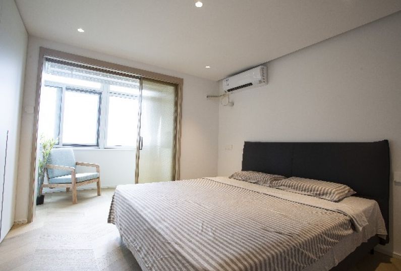 主臥:主臥室和客廳用霧化玻璃的形式分割,增加客廳的采光的同時也保證臥室的獨立和私密性,臥室門采用高度到頂?shù)哪举|(zhì)隔音門,隔音問題可以解決,床體對面為整排衣柜,陽臺區(qū)為書房工作和休閑區(qū)域,增加儲物功能。