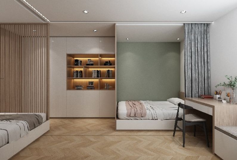 兒童房:兒童房是隨性可安靜的,是活潑與趣味的空間,兩個床可獨立,衣柜書柜功能,兩個學習桌,風景里讀書,一起成長的快樂。陪伴是彼此的相守,長高是彼此的約定。