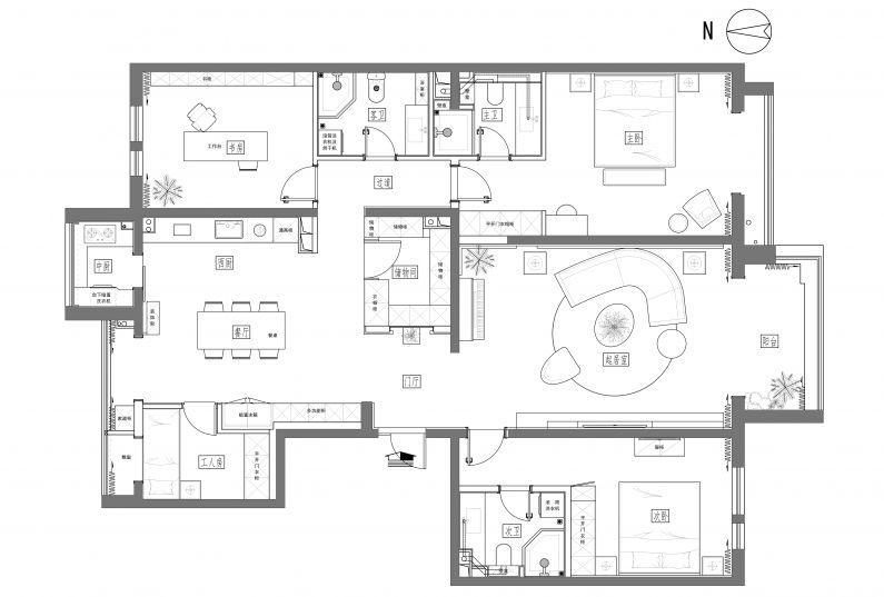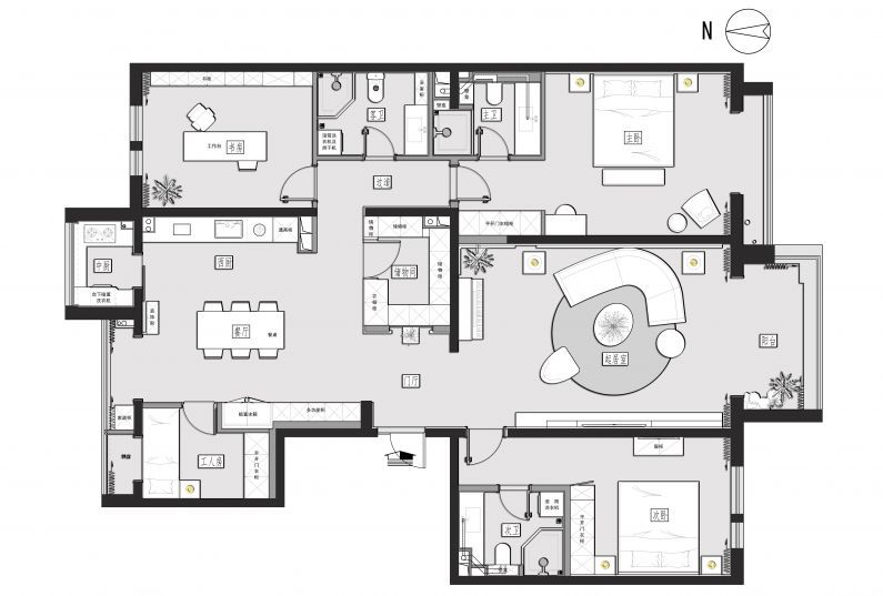廚房:廚房分成了中西廚,中廚移至廚房北陽(yáng)臺(tái),由單扇玻璃推拉門來(lái)阻斷油煙,西廚和餐廳采用開放式設(shè)計(jì),使房屋整體空間更加開闊敞亮。采用隱藏式冰箱隱于多功能柜中,工人房采用的隱形門設(shè)計(jì),提升空間整體感。