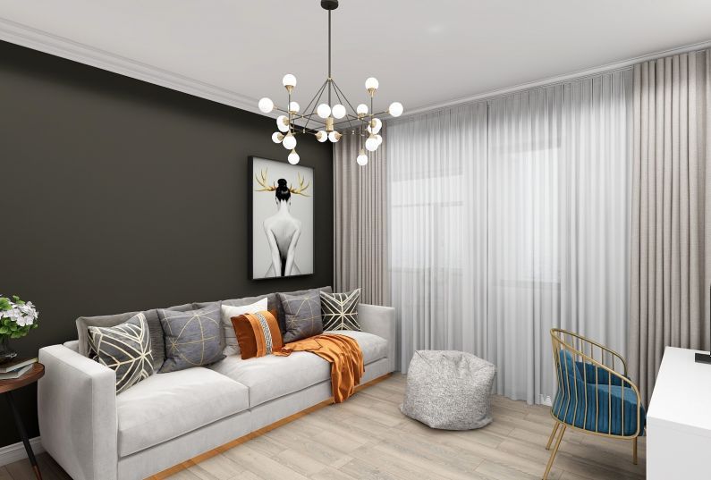 本案是一套美式簡(jiǎn)約家居,客廳的設(shè)計(jì)簡(jiǎn)約大氣、線條洗練,淡色系墻面、天花板、沙發(fā)與深色系的茶幾、墻紙相得益彰,賦予空間平衡之美 ;摒棄一切煩瑣和奢華,去掉零碎的空間劃分,去掉堆砌的顏色和擺設(shè),去掉繁復(fù)設(shè)計(jì)的家具,但整個(gè)空間看起來(lái),卻又簡(jiǎn)而不凡。