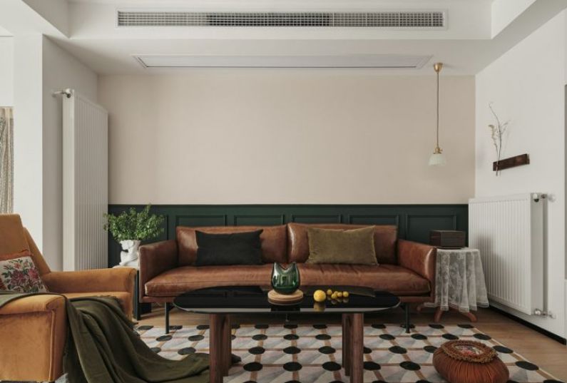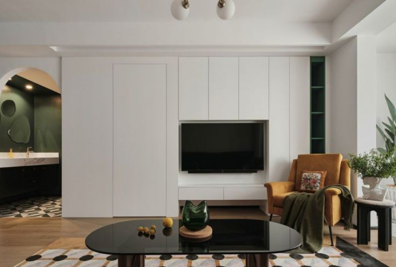 所見即所愛,因為熱愛,所以多彩。墻面色調(diào)與家具的色彩碰撞,豐富的色彩組合,讓空間活潑生動。光線透過白紗,享受溫柔的自然光。客廳后面向南主臥是父母住的,隱形門打開,步入父母的房間。最愛那一抹綠,用墨綠色裝飾沙發(fā)背景墻,形成拼色效果,石膏線上墻層次分明,氣質(zhì)滿滿。棕色皮質(zhì)沙發(fā),玻璃茶幾,帶有幾何元素的地毯,復(fù)古的味道油然而生,設(shè)計一個家,圓一個夢。沙發(fā)邊幾用藝術(shù)花瓶稍作點綴,時而可以來些綠植鮮花裝扮,給生活多加些喜愛的色彩。電視背景墻,是通過將客廳與主臥的墻體打掉,借用了一些主臥面積增加客廳儲物,通過改變主臥進(jìn)入方式,也讓主臥的儲物空間變多。餐椅搭配卡座,滿足一家四口人的用餐需求,卡座還可以儲物。不經(jīng)意間,就能捕捉到空間里的一抹綠,不需要濃墨重彩,幸福的生活在點滴間相遇。