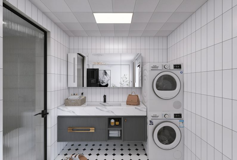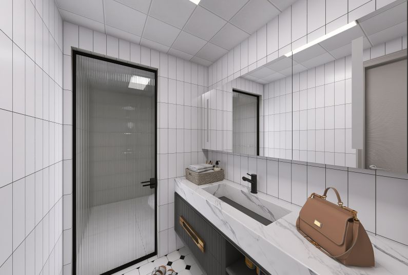 U字型造型裝飾櫥柜。配以白色小規(guī)格墻磚,使整個空間色調(diào)更加時尚,典雅。