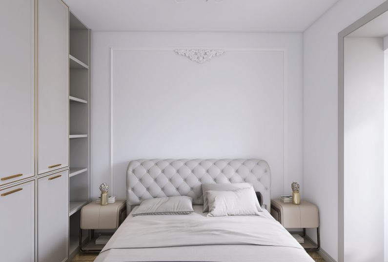 地面鋪貼原木色人字形地板,墻面粘貼石膏平線并點綴石膏雕花角線作為墻面裝飾,墻面涂刷白色的乳膠漆