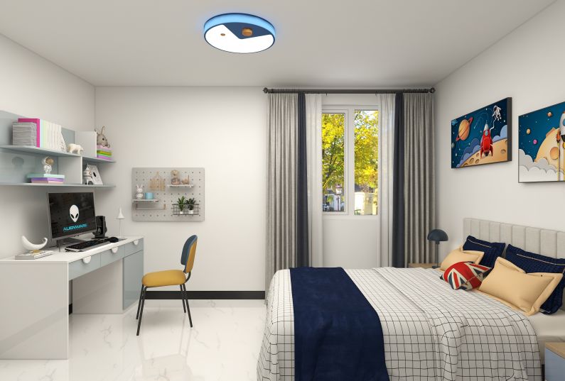 次臥為兒童居住,需要容納睡床、衣柜、寫字臺(tái)等齊全的配備功能,采用定制柜體做床鋪,顏色搭配的很跳躍,增加儲(chǔ)物空間同時(shí)保證房間的開闊。