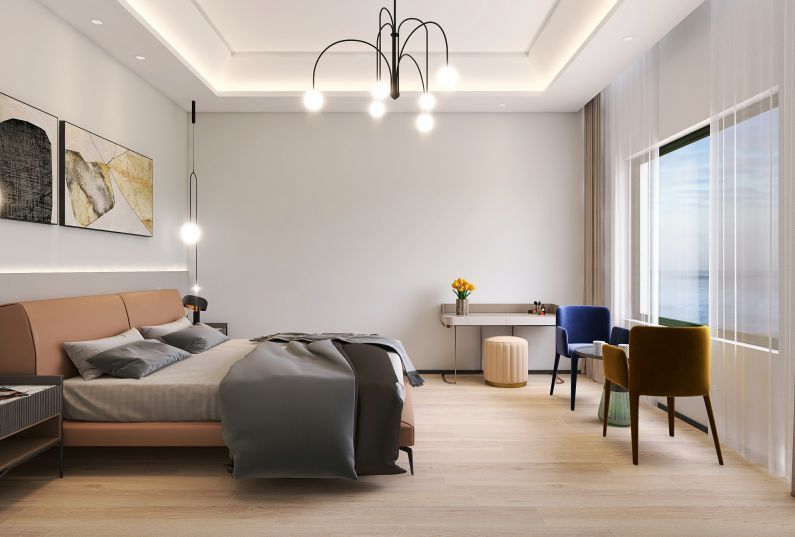 整體空間為現(xiàn)代簡(jiǎn)約風(fēng)格,客廳和臥室空間以白灰色調(diào),搭配現(xiàn)代風(fēng)格的家具配飾,簡(jiǎn)約清新;茶室空間搭配新中式風(fēng)格家具,禪意雅致;