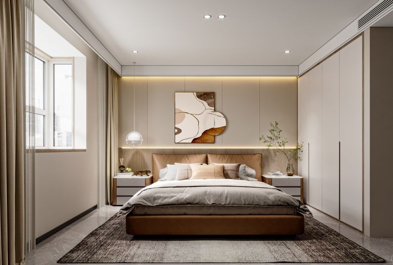 主臥空間采用無主燈照明,見光不見燈讓主人到這個(gè)環(huán)境里可以完全放松下整體沒有過多得裝飾,色彩上采用了白色和木色讓整個(gè)空間顯得更加的干凈純粹。