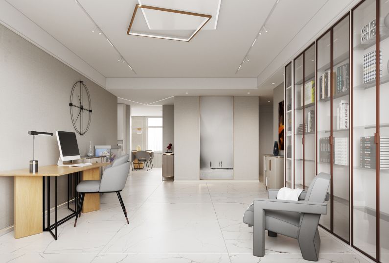 透明展示的玻璃書柜搭配上造型好看的書桌沙發(fā)。