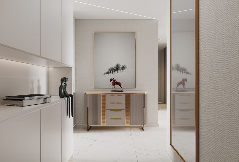 玄關上下分層的鞋柜都是簡約風格無把手的設計,