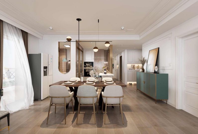 入戶玄關(guān)兩扇造型金屬邊框的長(zhǎng)虹玻璃把采光給到旁邊空間。同時(shí)也提升了入戶的儀式感??筒蛷d空間連貫,墻頂面是北歐風(fēng)格的造型線條。家具燈飾的元素也是配合整體風(fēng)格。
