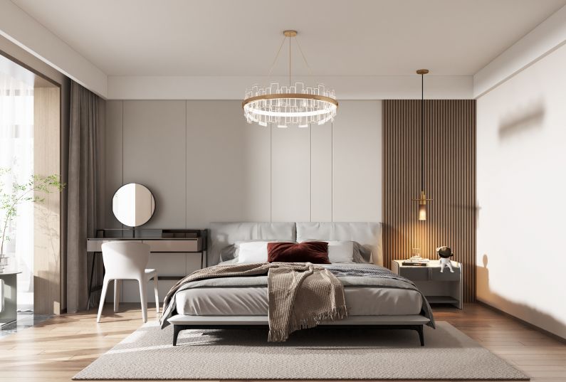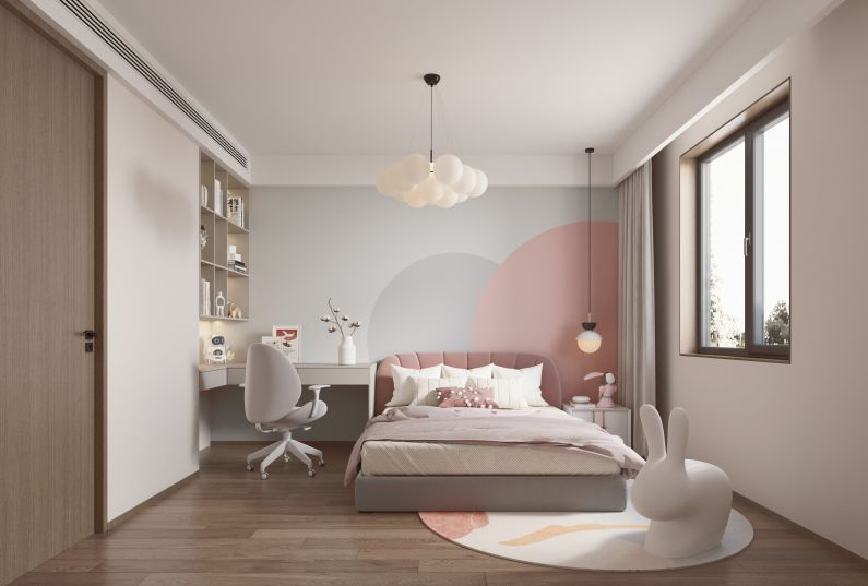 和主臥和兒童房的色彩搭配不同,次臥使用了更為穩(wěn)重的莫蘭迪色系,延續(xù)客廳空間的整體風(fēng)格。