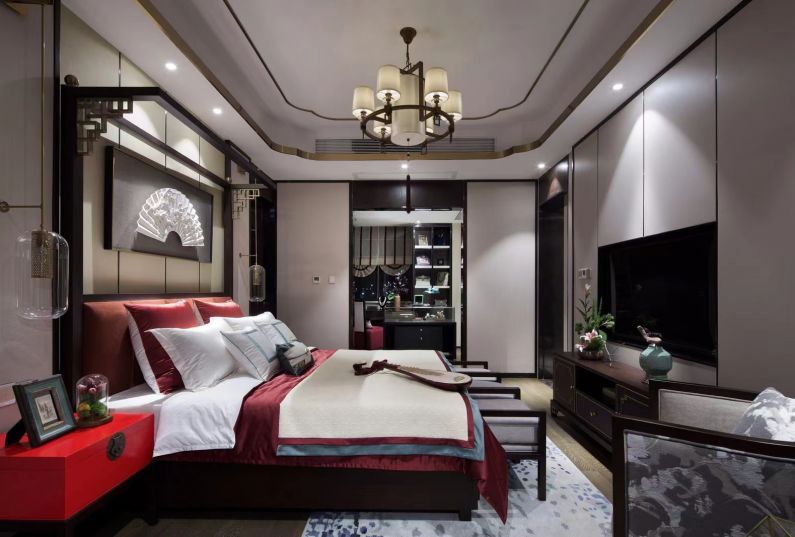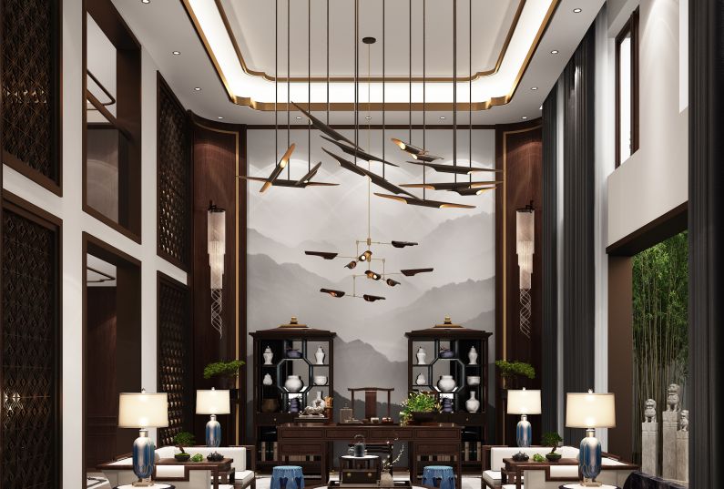 3、本次新中式融合傳統(tǒng)紅木家具,在風(fēng)格中有所突破,注重墻面裝飾和雕刻