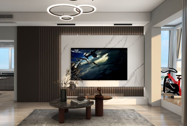擁有人間煙火的干凈氣息。本案的整體設(shè)計使用黑白灰色系給予了空間理性簡約的基調(diào),黑白灰的碰撞打造出極簡又極具時尚感的空間氛圍。入戶的玄關(guān)柜運用不同材質(zhì)的碰撞堆疊打造立體幾何感,簡單又具有設(shè)計感,實用與美觀相輔相成??蛷d電視墻為了讓整面墻整齊劃一,設(shè)計了隱形門+巖板設(shè)計。用巖板瓷磚上墻做裝飾,點綴了胡桃木格柵板。主臥的設(shè)計延續(xù)空間的整體風(fēng)格,以簡約線條為基調(diào),黑白搭配打造寧靜舒適的休憩空間體驗。空間中線型燈光的設(shè)計給空間加了分。光影如同空間的魔法師,賦予了空間豐富的表情,體現(xiàn)出空間年輕時尚的一面。