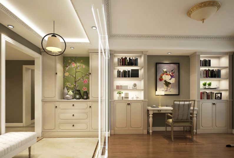 首先在總體布局方面依業(yè)主要求將原來的3居改為4居,增大使用功能且區(qū)分明確,滿足生活需求。獨立的玄關設計不僅淡化了入室即見廳的尷尬,又增大儲物空間。鞋柜處設立換鞋凳,這一小細節(jié)體現(xiàn)設計充分為業(yè)主考慮。玄關處藝術玻璃的應用不僅解決了獨立門廳設立后通風采光受到影響的問題又增加了浪漫神秘的藝術氣息。