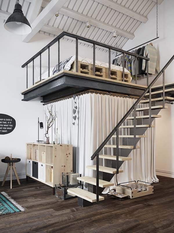公寓面積不大,主人是一對年輕夫妻,為了盡量節(jié)省空間,沒有單獨的劃分臥室,而是將其放到了局部的二層夾層上,下方用布簾圍合出一處衣帽間及儲藏間。
