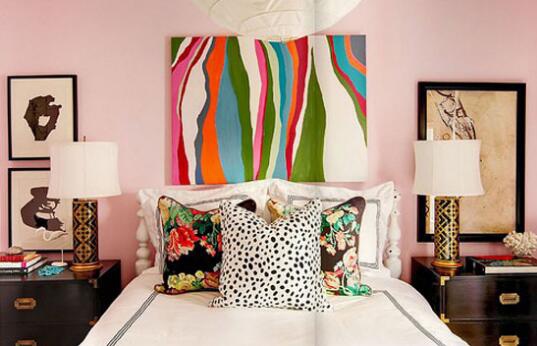 手繪的裝飾畫讓這間臥室視覺中心聚集到墻面,而選擇整體的粉色墻面,與臥室里黑色構成光鮮的對比,弱化了空間的結實,使女性的美好漸漸滲入,簡單的床品和粉色的墻面相映成趣,讓空間中結實和美好的對話加倍順暢。